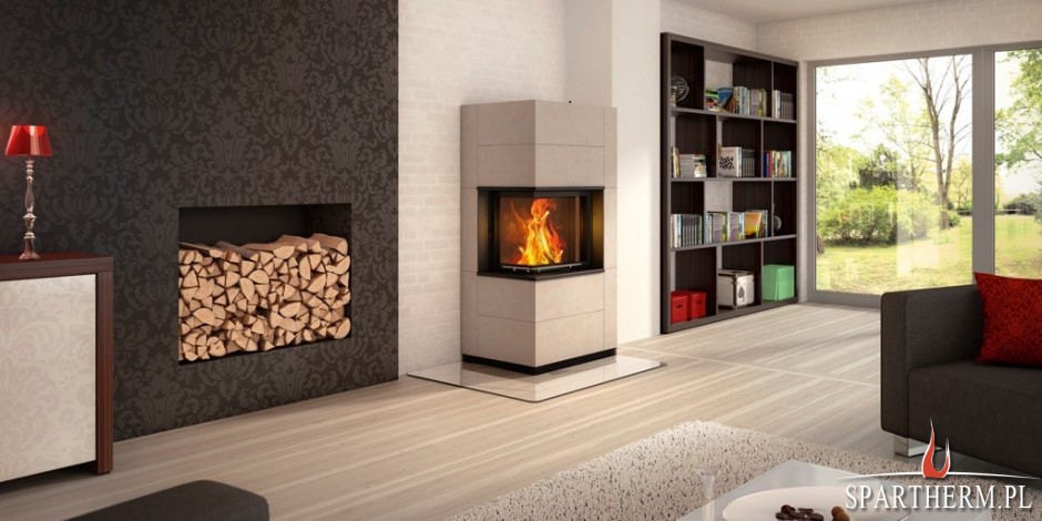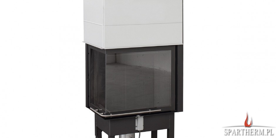 Wkład kominkowy z kątową szybą otwieraną do góry. Kominek lewostronny, uchwyt do otwierania szyby w dolnej części drzwiczek.